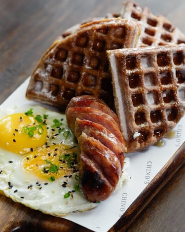 crispy bacon, eggs, crispy waffles, brown butter maple syrup