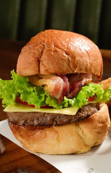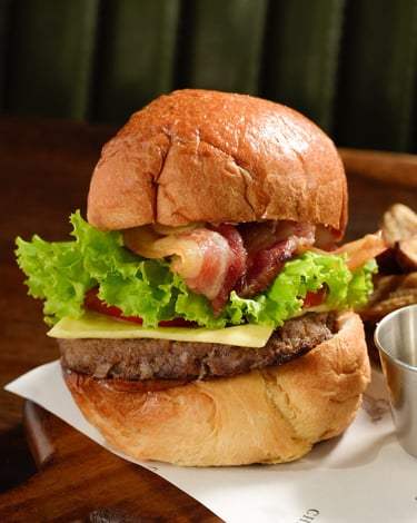 double patty, bacon jam, cheese, lettuce, tomato, pickles